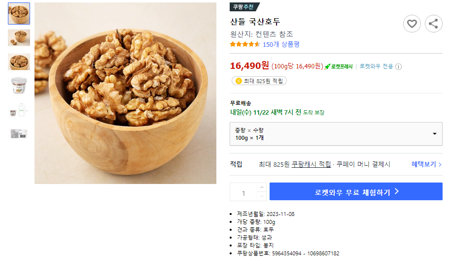 5. 쿠팡은 '국내산 호두'를 검색했을 때, 상위순위가 피호두가 아닌 깐호두였다. 쿠팡을 사용하는 대부분의 소비자는 귀찮은 것을 싫어하기 때문에 직접까서먹어야하는 피호두보다 깐호두를 선호하는것일까?