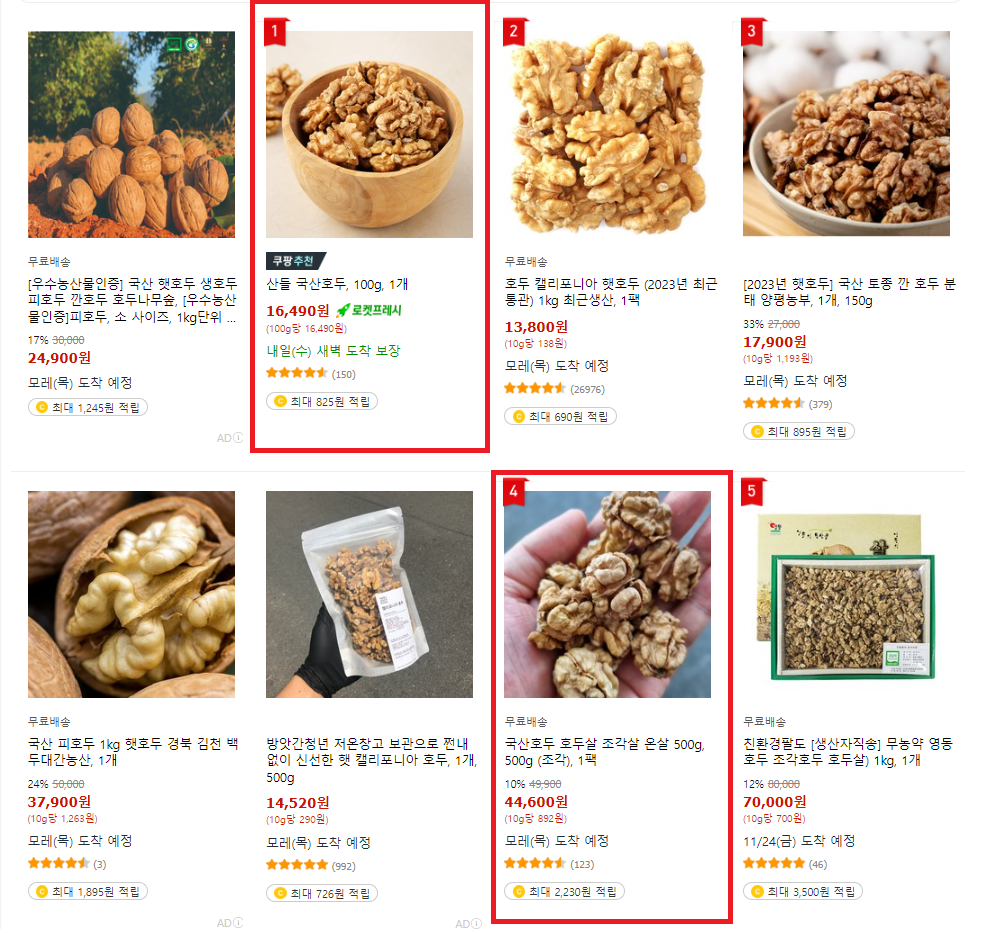 4~5번째는 쿠팡에서 '국내산 호두' 키워드를 검색했을 때,