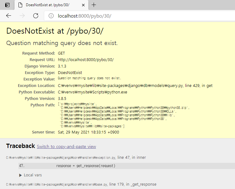 /pybo/30/ 에 접속해보자. 그러면 다음과 같은 DoesNotExist 오류 화면이 나온다.
