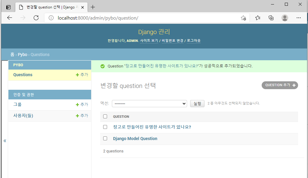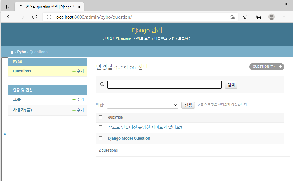 장고 Admin으로 돌아가 새로고침하면 아래와 같이 Question이 추가되어있다.