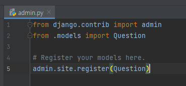 pybo/admin.py 파일에 다음의 코드를 입력하여 Question 모델을 장고 Admin에 등록하자.