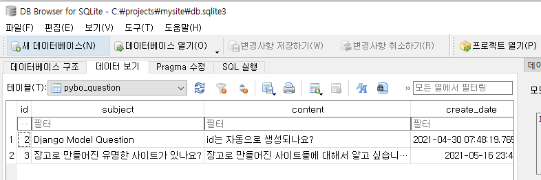 아래와 같이 DB에 데이터들이 pybo 웹 어플리케이션에 정상적으로 출력되었다!