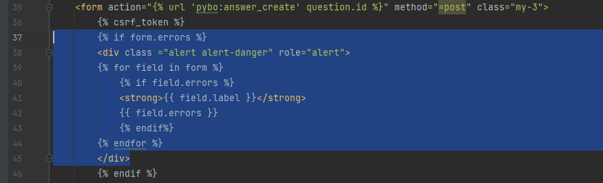 제목의 value에는 value="{{ form.subject.value|default_if_none:'' }}을 대입했는데, 이는 오류 발생시 기존 입력값을 유지하가 위함이다.