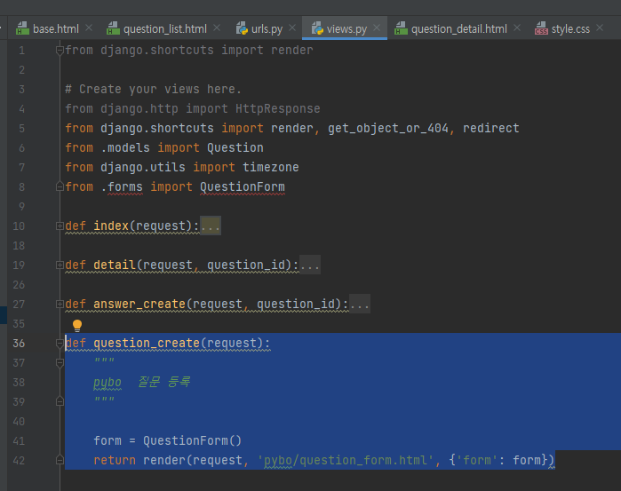 2단계에서 URL 매핑에 의해 실행될 views.question_create 함수를 추가하자