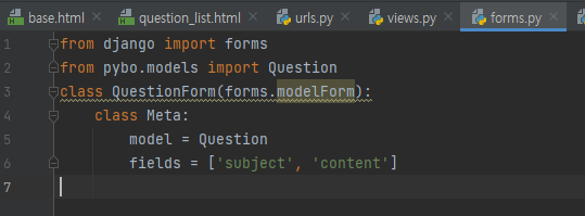 pybo 디렉터리 바로 아래에 forms.py 파일을 새로 만들어 ModelForm을 상속받은 QuestionForm 클래스를 작성하자.