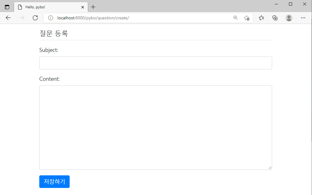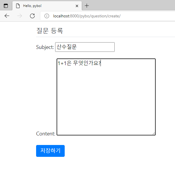 템플릿에 작성한 {{ form.as_p }} 에 의해 나타난 입력 항목 subject, content 를 확인할 수 있다.
