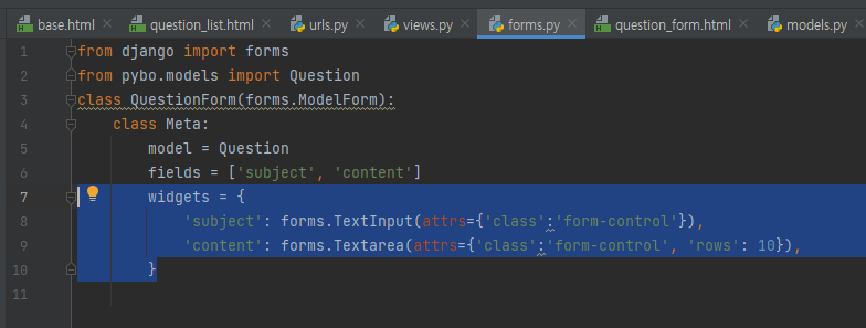 그러나 완벽하지는 않지만, QuestionForm 클래스 내부에 있는 Meta 클래스에 widgets 속성을 추가하면 적용이 가능하다.