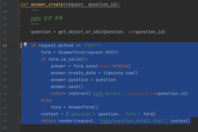 그런 다음 pybo/views.py 파일의 answer_create 함수를 수정하자.