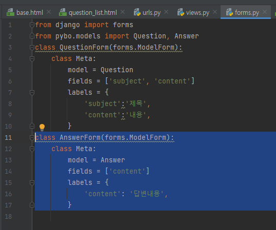 답변을 등록할 때 사용할 AnswerForm 클래스를 pybo/forms.py 파일에 다음과 같이 작성하자.