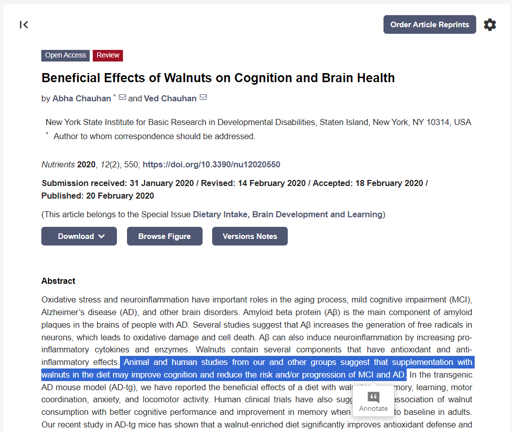저희 그룹과 다른 그룹의 동물 및 인간 연구에 따르면 식단에 호두를 보충하면 인지 기능이 향상되고 MCI 및 AD(알츠하이머)의 위험 및/또는 진행이 감소할 수 있습니다.
